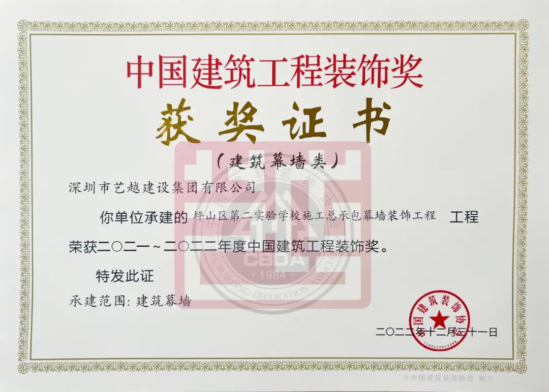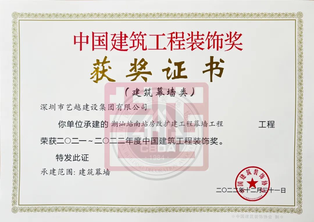 近日,備受關注的中國建筑裝飾獎揭曉,由藝越建設承建的新建鐵路梅州至潮汕鐵路潮汕站南站房改擴建工程、潮汕站南站房改擴建工程幕墻工程、坪山區第二實驗學校施工總承包幕墻裝飾工程,榮獲建筑裝飾行業最高榮譽獎項——中國建筑工程裝飾獎,為我司榮譽墻再添新勛章!